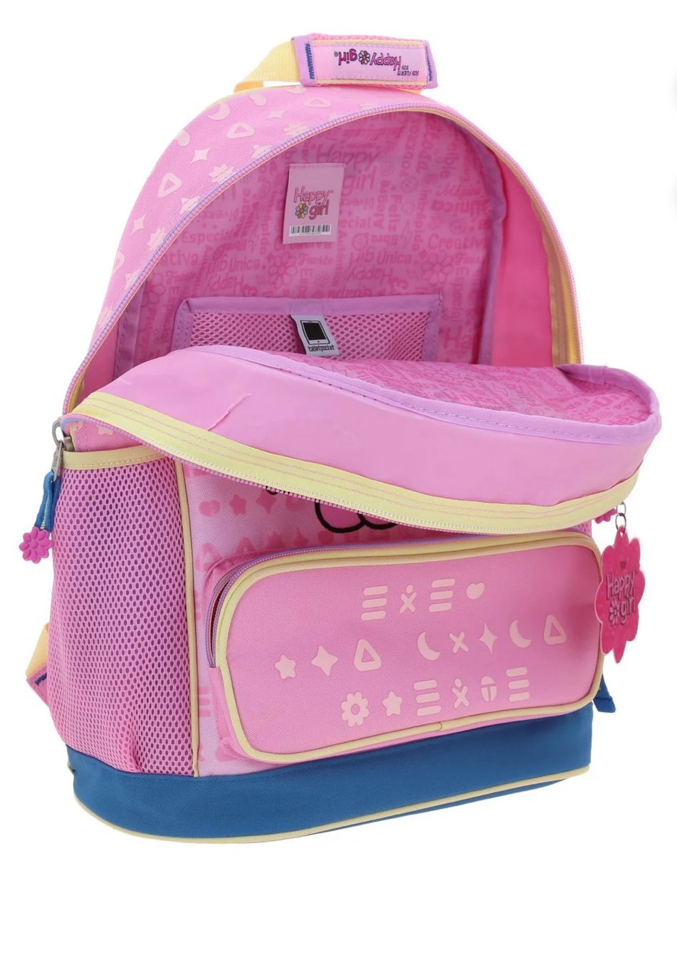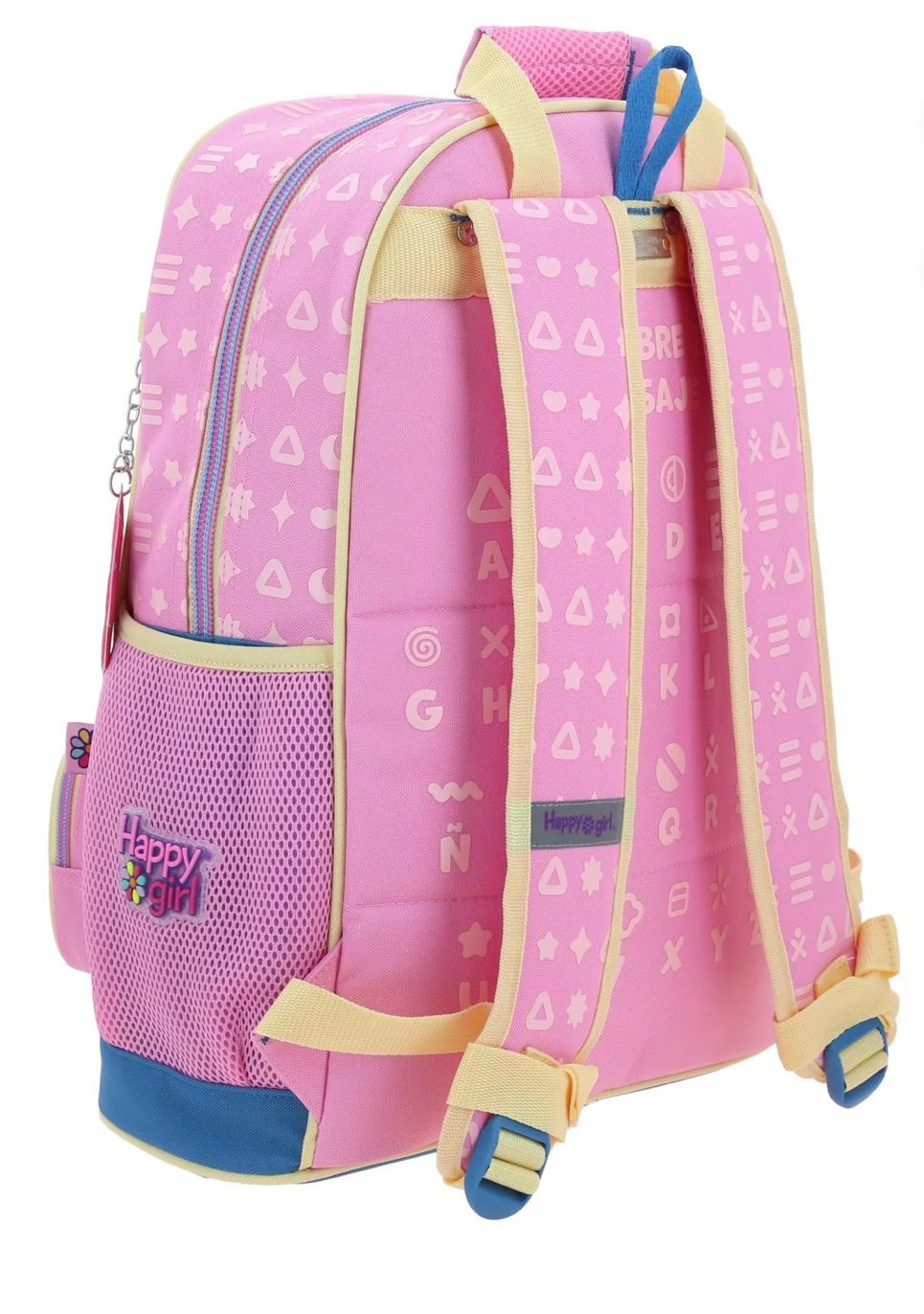 - Color: Rosa claro con detalles amarillos y azul